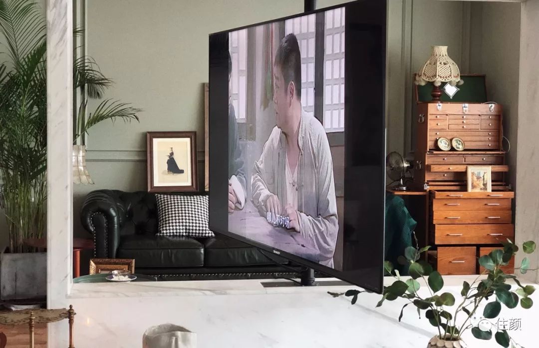 客厅与休闲区中间,做了一个可360度旋转的爵士白大理石电视背景墙,作为两个功能区的隔断。日常在休闲区饮茶或在书房工作时,也可以把电视转过来观看。