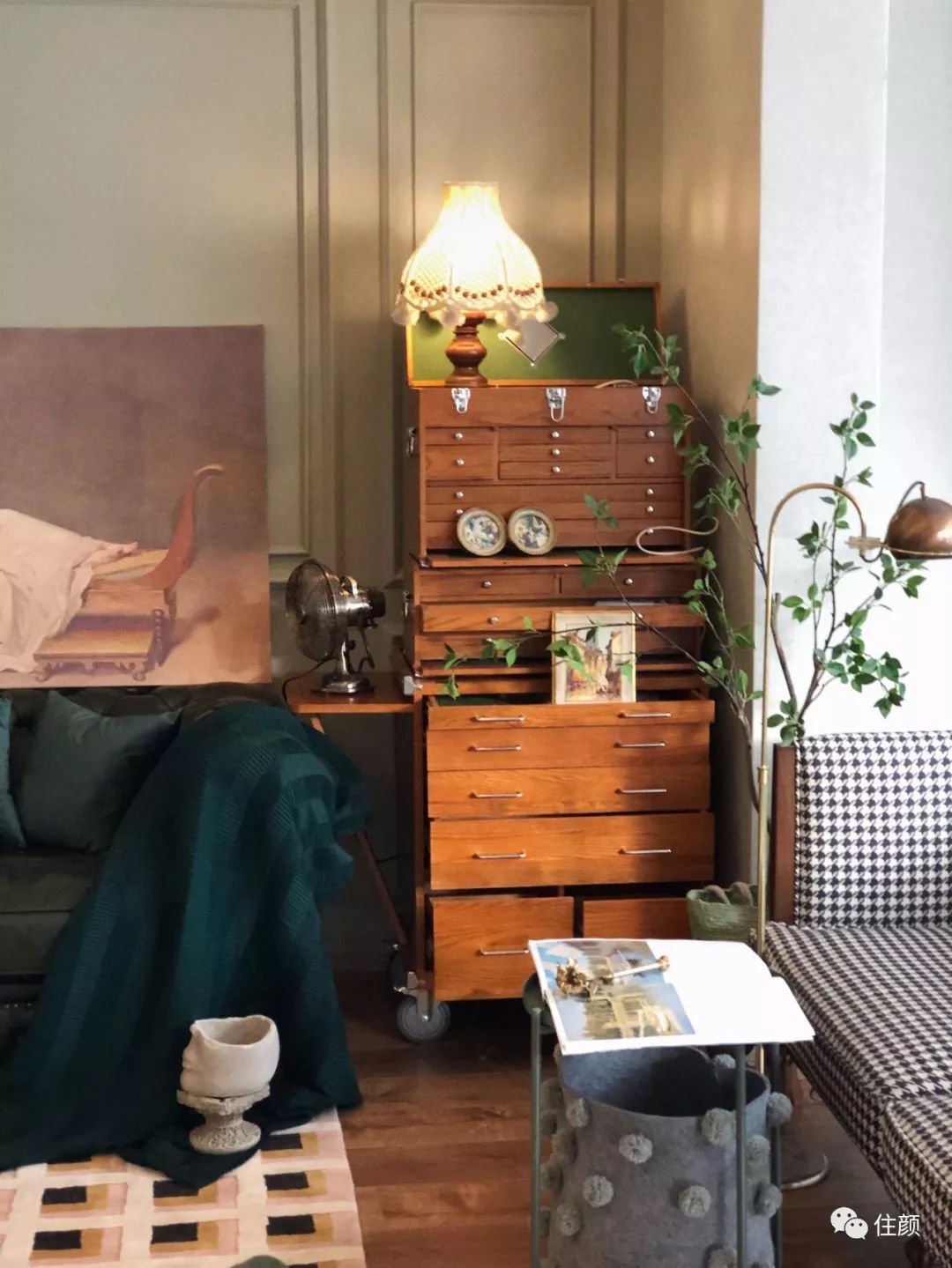 海淘的中古落地灯与被塞的满满当当的复古工具箱,油画里温柔的女人,让整个空间都变得柔和起来。