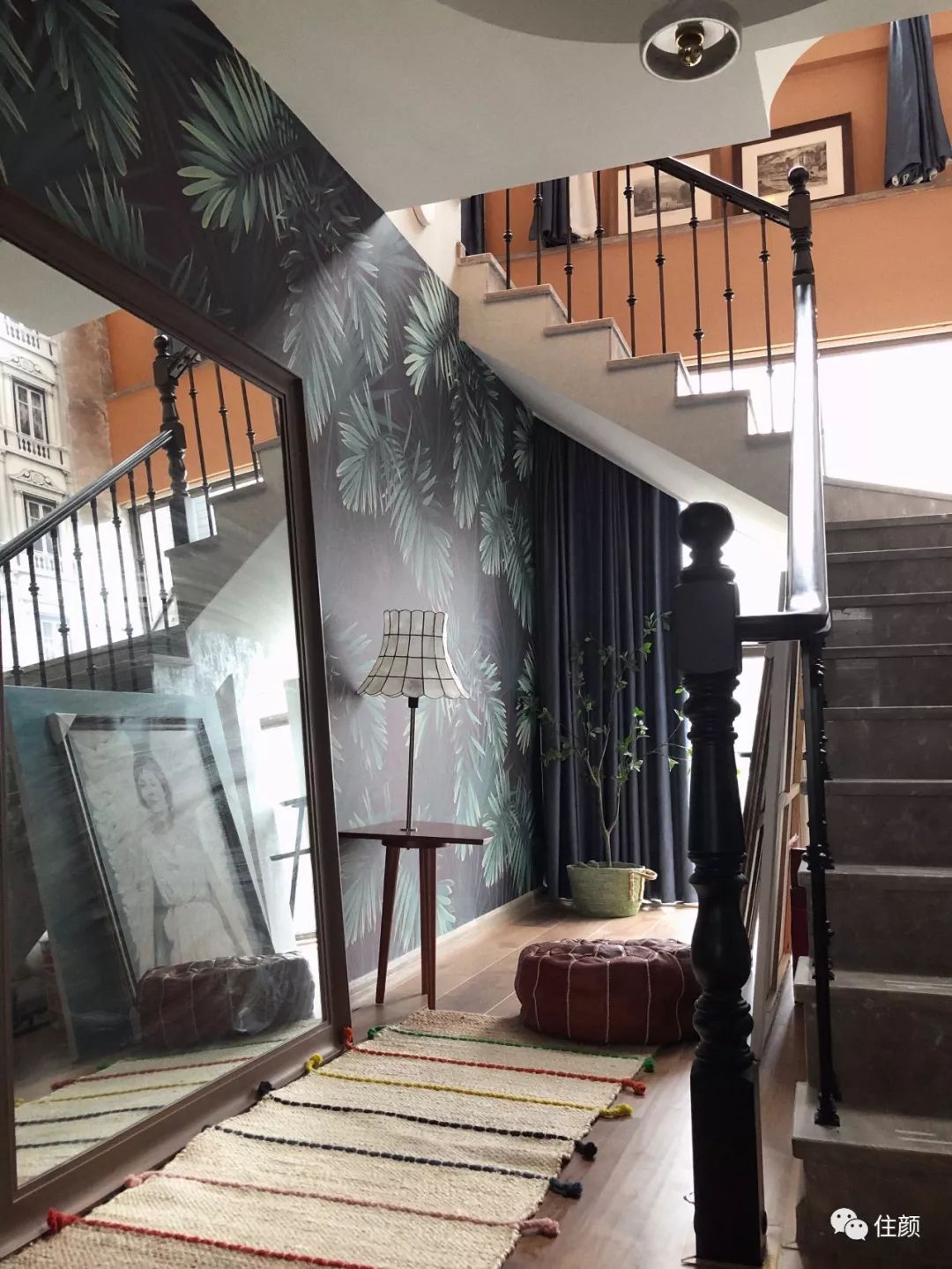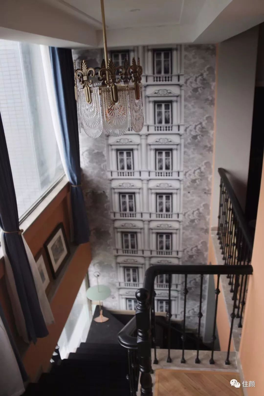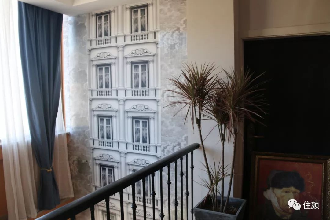 楼梯挑高处的乌云壁纸,因为太多人使用难免视觉疲劳,屋主特意自己做了点儿小加工。