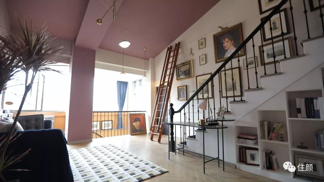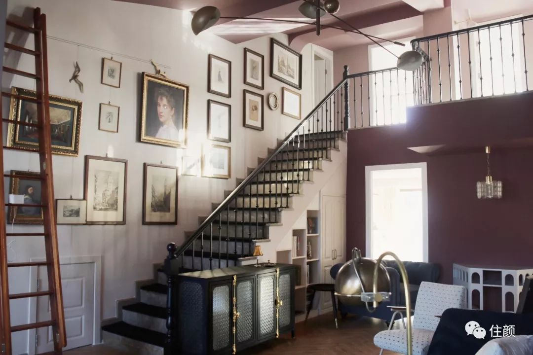 因为不想舍弃挑高的通透空间,便把自己所有收藏的画都挂在二楼,打造成画廊的效果。除了挂画区的色彩相对简单,其他三面墙分别用脏粉色、干枯玫瑰色和紫红色来衔接。