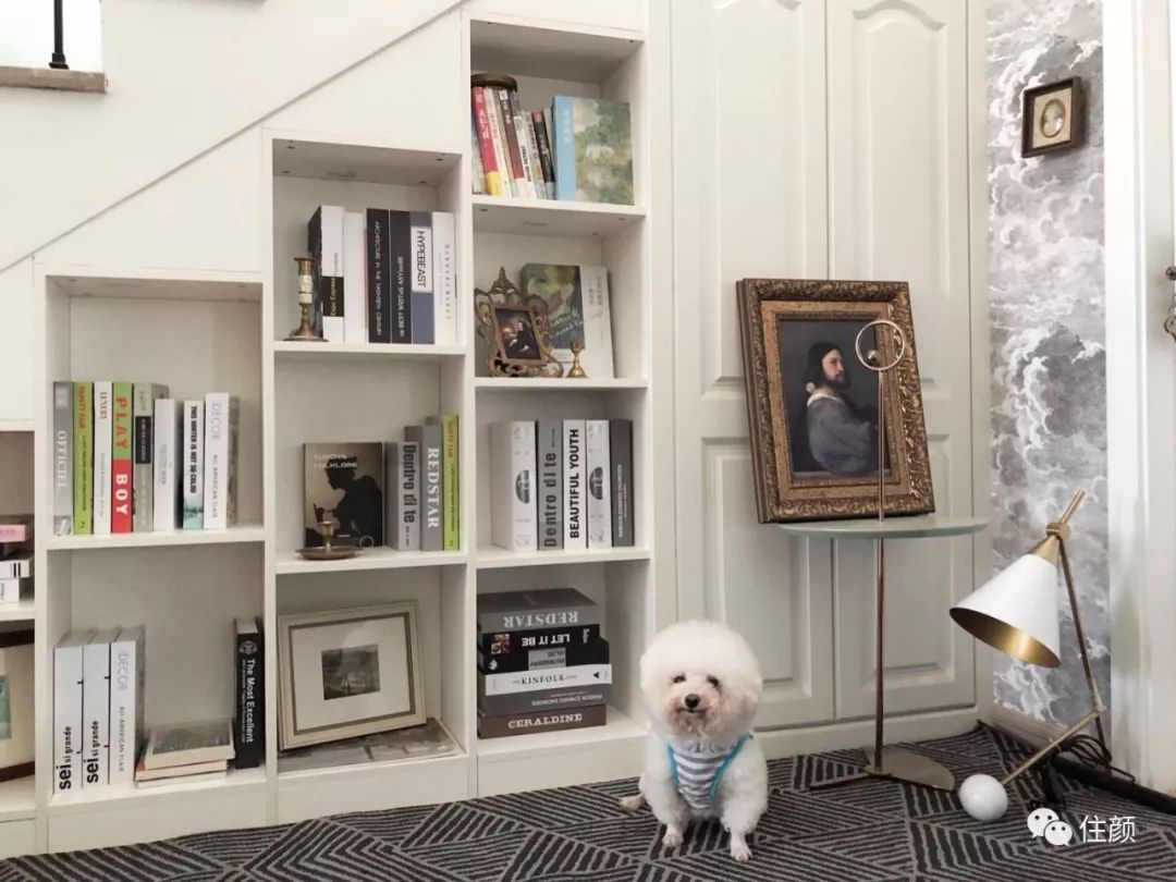 二层的楼梯下方也完全没闲着,将楼梯下的空间做成隐藏式书柜墙,收纳装饰一举两得。