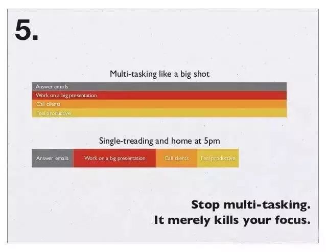 请不要多任务同时工作,这只会消耗注意力,一件一件事情完成,那你可能5点就能在家陪伴家人。
