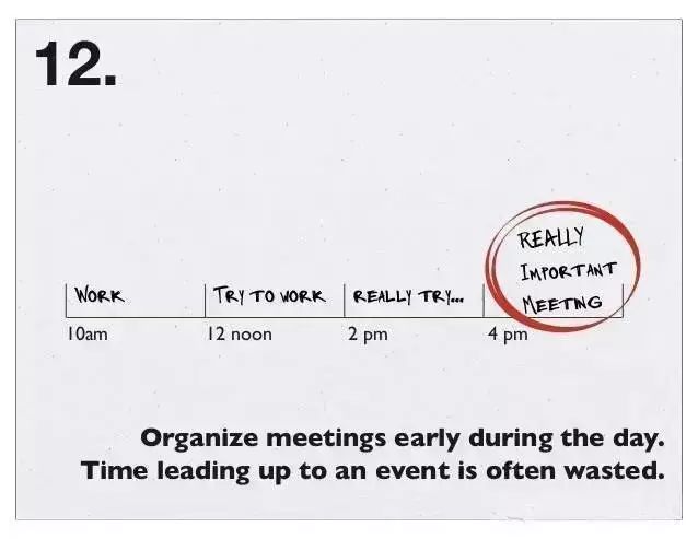 尽量把会议往前安排,因为通常用于准备会议的时间,往往都是被浪费掉的。
