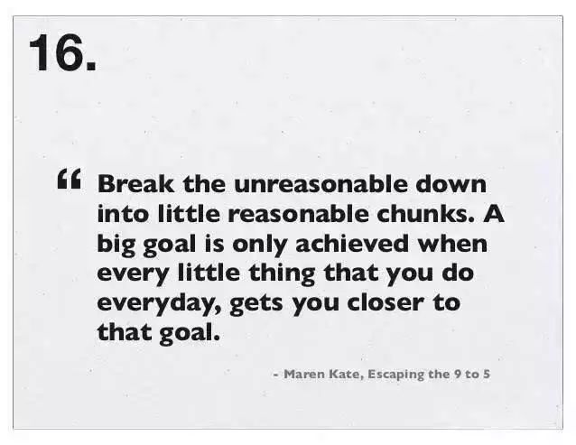 把宏大的、无法马上实现的目标分割成合理的小任务,只要每天都完成小任务,你就会越来越接近那个大目标了。