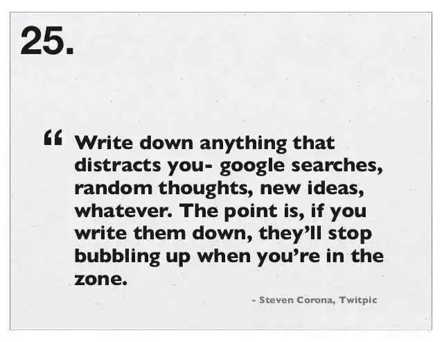 进入高效状态后,记下任何可以分散你注意力的东西。比如Google搜索词、灵光乍现的想法、新点子等等。如果你把它们记下来,它就不会再蹦来蹦去了。