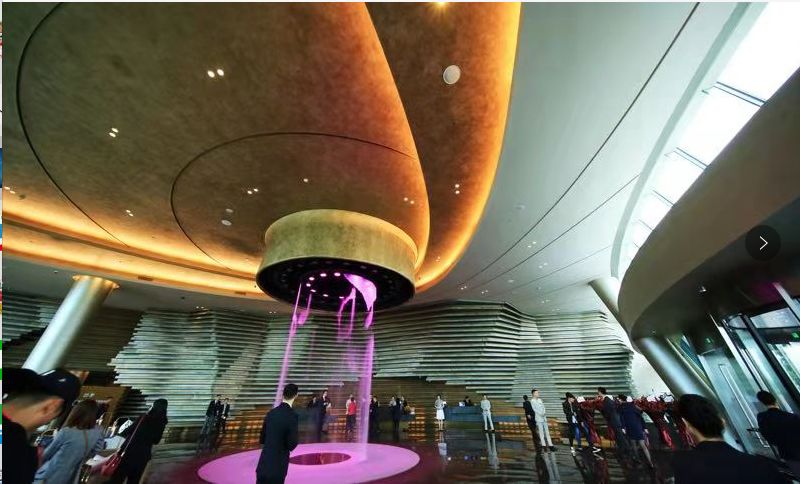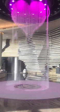 酒店大堂内有一根色彩绚丽的动态水柱