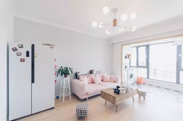 房间整体是以白色为主,显得干净优雅,墙面上也暂时没有太多的装饰元素,到后期的话,需要添加一些软装。沙发则是使用了粉色的色调,突出了一种浪漫的质感。