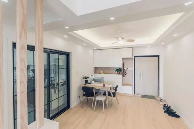 这边是餐厅的空间,餐厅就在入户门的旁边,做了一个充足的收纳柜子,可以当餐边柜使用。不过由于空间的问题,进房间的鞋子暂时是放在墙边的,看来后期还是需要规划出一个小小的鞋柜空间呢。