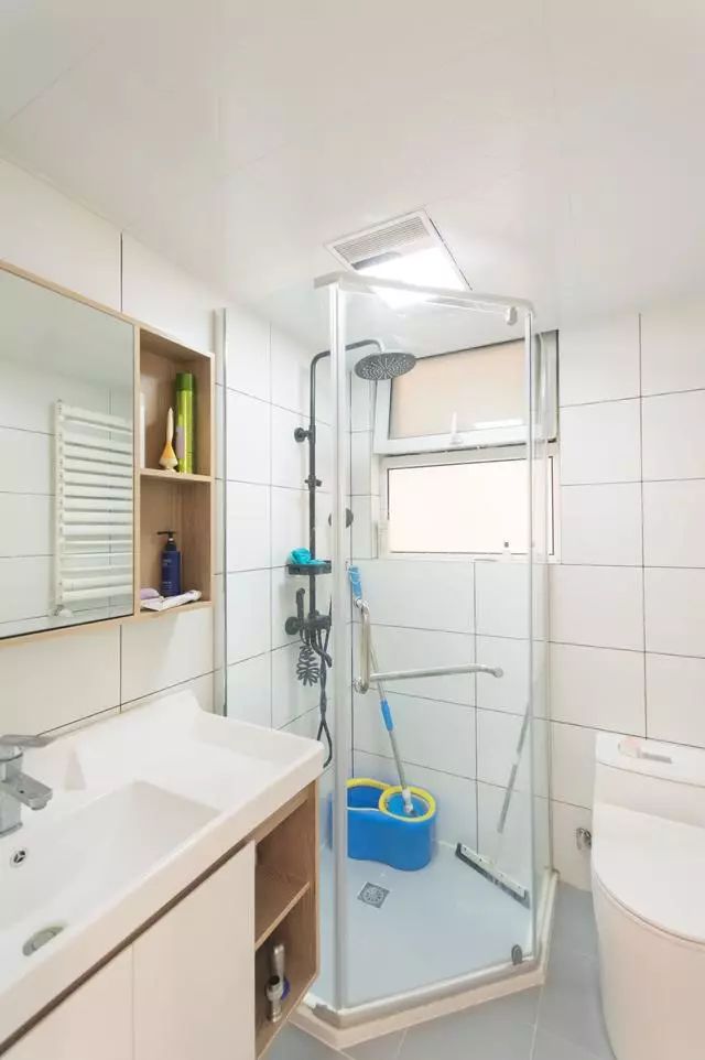 卫生间里面的布置,墙面是白色的瓷砖,然后墙角是一个淋浴房的空间,整体规划的还是比较完美的,虽然空间不是很大,但是功能还是比较齐全的。