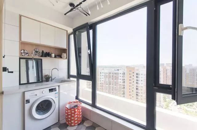 下面我们就来看看阳台的空间吧,阳台两边都打了柜子,一边放了洗衣机,这边还有一个洗手台,功能十分的完善。