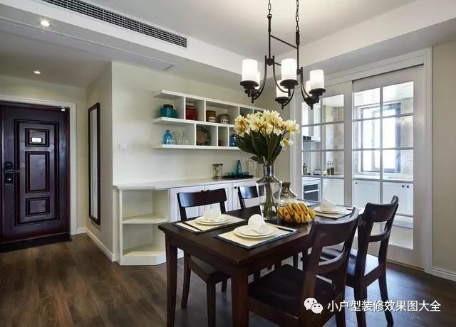 进门的玄关地方就装饰着一面全身镜,进出门的时候可以整理一下仪容仪表,对面就是鞋柜和衣架,通过玄关之后就是餐厅了,深色的原木家具,古朴的吊灯,精致带着一种沉稳的韵味感。