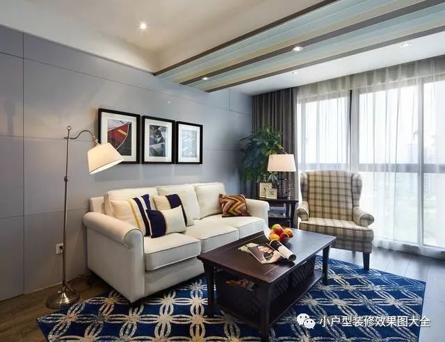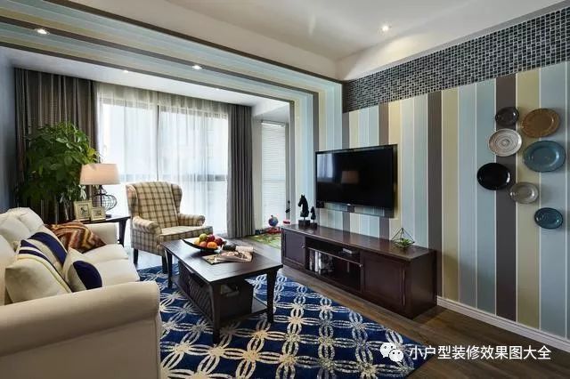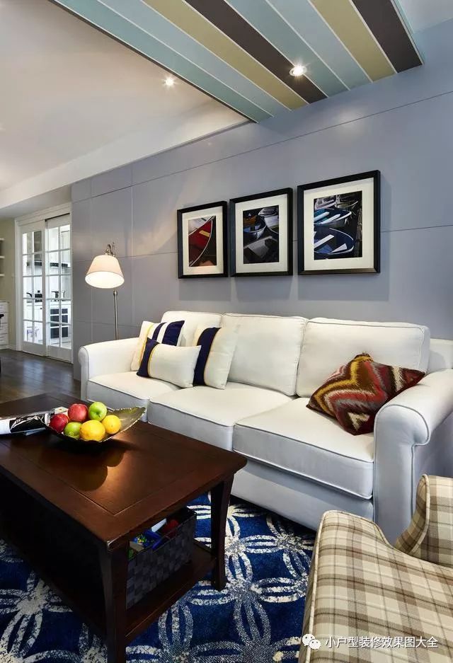 客厅的上方用的是四种颜色的彩虹状条纹的装饰,有点点的活泼感。
