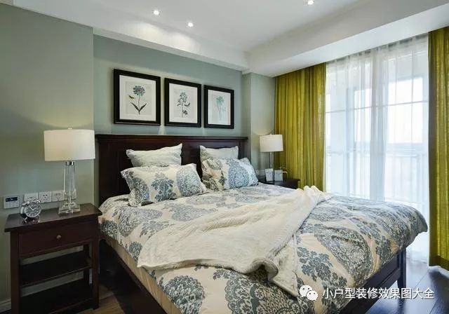 主卧的装饰是很经典的美式风格,典雅的花色,很有一种清新宁静的感觉,绿色的窗帘带有一种自由感。
