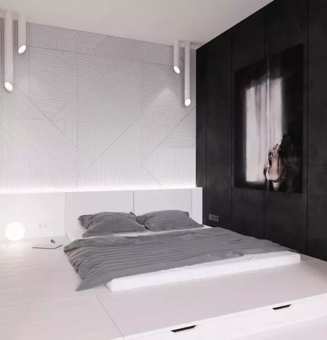 你甚至可以在延长的床头背景墙上“大做文章”,利用巨幅装饰画、壁龛设计以及隐藏式的灯带,为室内打造精致时尚氛围,带来意想不到的装修效果。