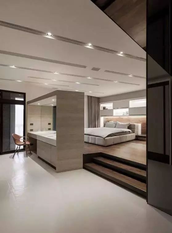 因为传统的主卧设计,往往遵循了千篇一律的模式,会被“床+衣柜+床头柜”这个固定的套路束缚住了。但卧室地台的设计,却可以额外增加更多的功能,诸如学习区、梳妆台、阅读区等,让居住体验大大升级,一股恰到好处的高级风与慵懒风扑面而来。