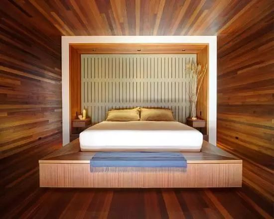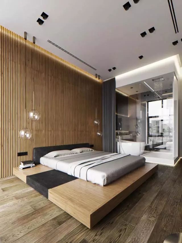 此外,一体化的设计还可以让视线得到延伸,采用木板上墙的形式营造出三面围合的效果,让睡眠环境变得更加温馨、舒适。