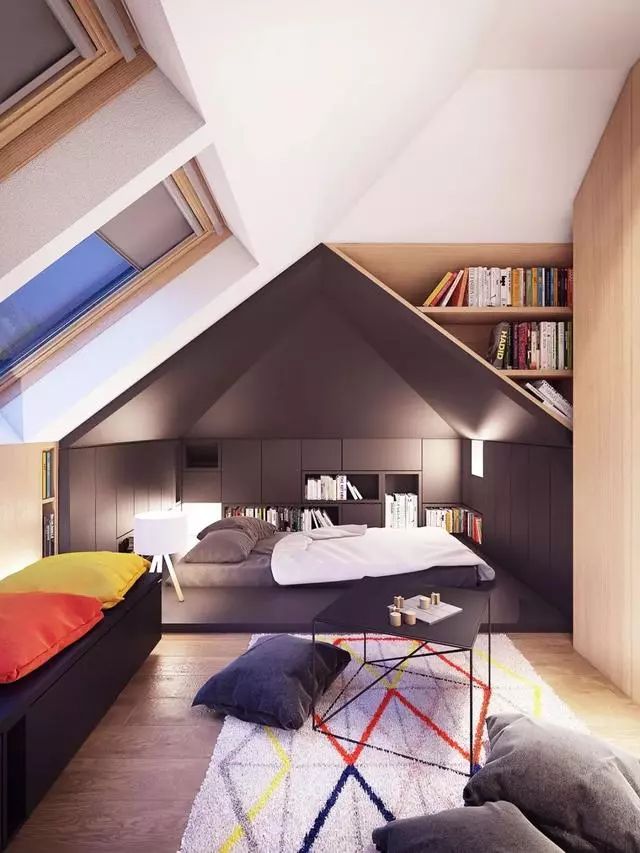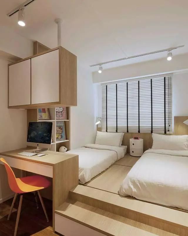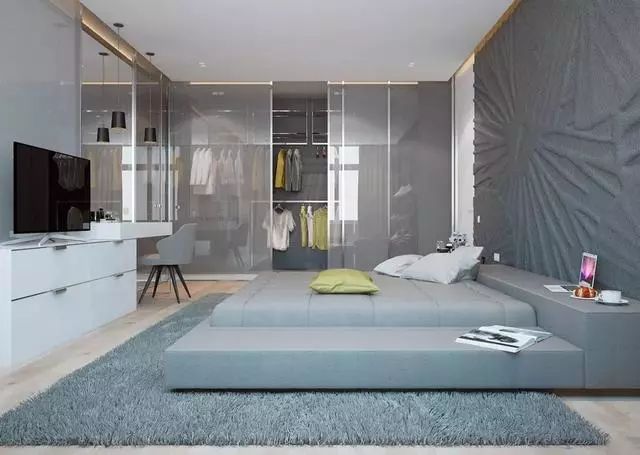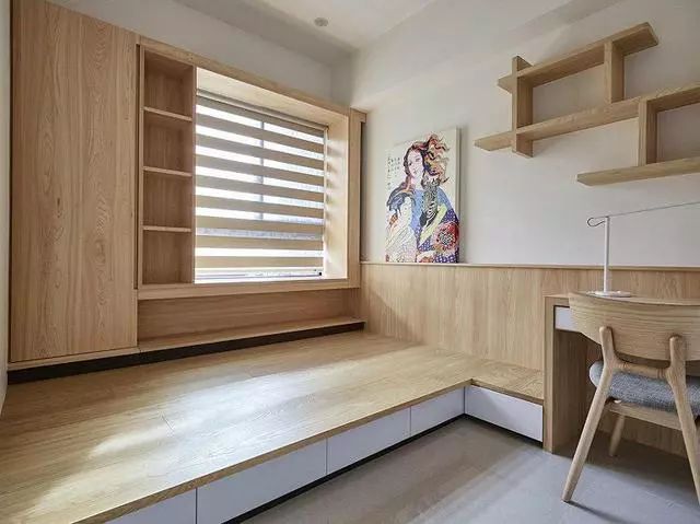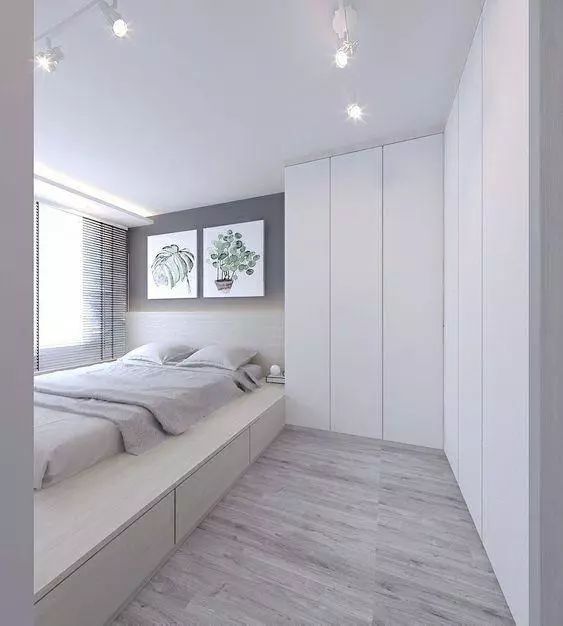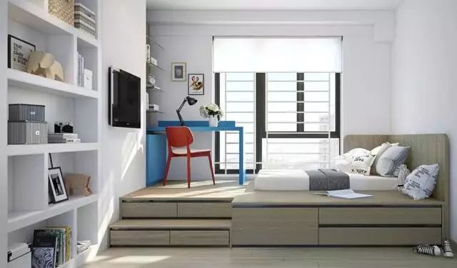 比如:在卧室里设置一张地台床,旁边组合书桌、衣柜一体化设计,底部预留出充足的储物空间,这样不仅可以收纳暂时闲置的衣物,也可以用来睡觉、办公、学习,一举多得。