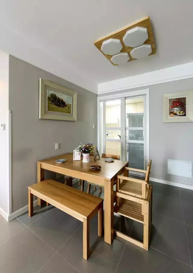 入户门正对着餐厅,考虑到开门的视觉效果,便将餐厅的桌椅靠墙摆放,从而扩大了过道的空间。