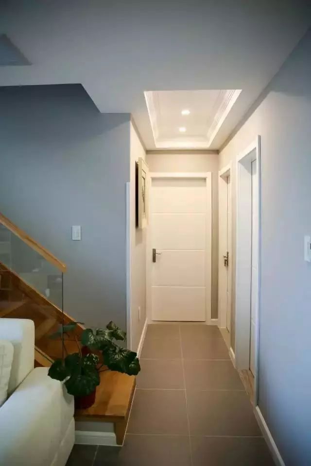 通往卧室及卫生间的过道,顶面简单地做了吊顶,然后四边角再用石膏线包住,做出来的效果很棒,也许我们很多人家里的过道也可借鉴这种方式;