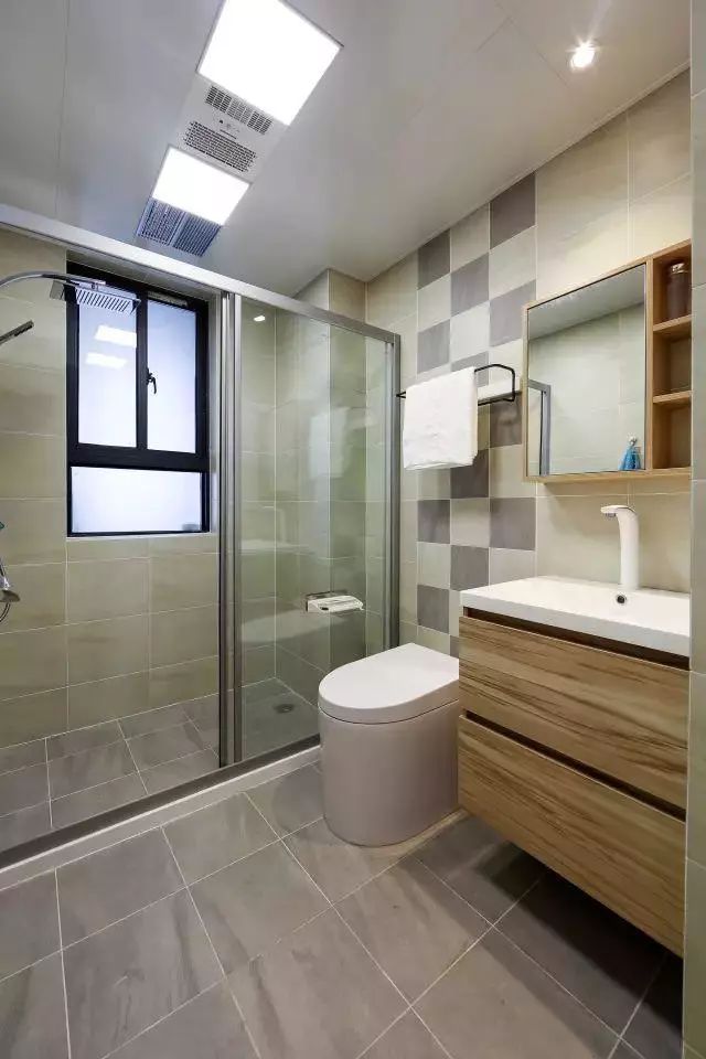 卫生间做了干湿分离,方便又实用,具有储物功能的镜柜,满足女生日常生活中对收纳的需求,马桶背后是由两种颜色的墙砖拼接而成的,使厕所更加有层次感。
