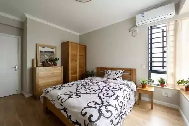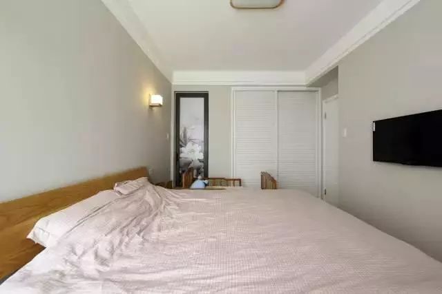 主卧色调以暖灰色为主,搭配上原木色的床,一切同样以简洁为主。