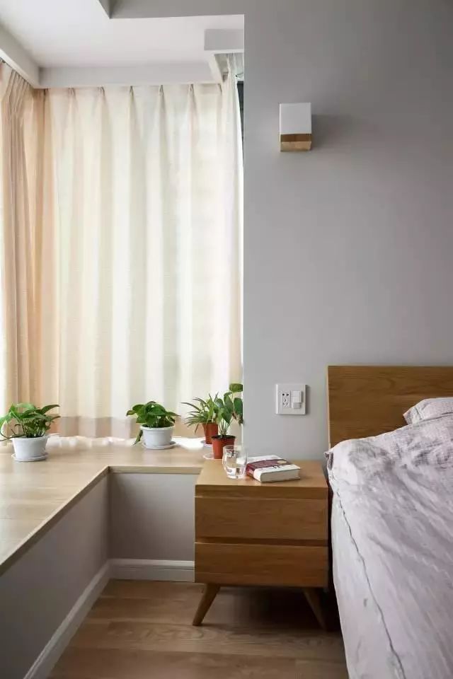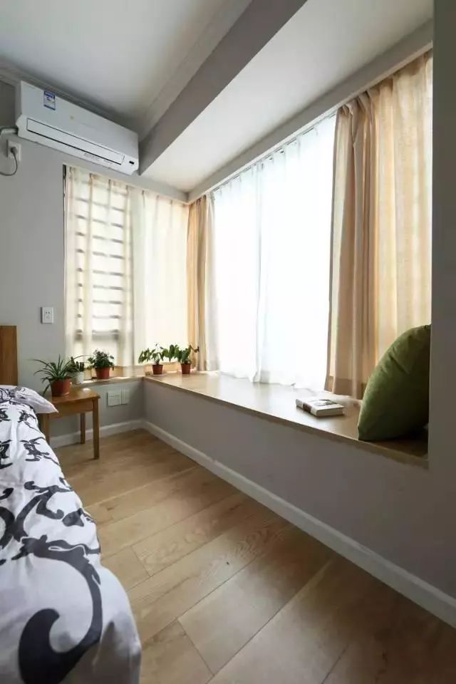 次卧内同样设有大飘窗,窗台铺上了木地板,与浅色的窗帘很搭,再摆上几盆绿色植物作为装饰,抱上一本书就可以在这坐上一个下午。