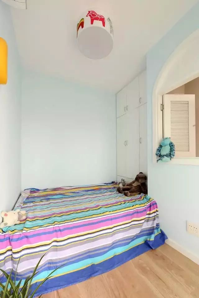 考虑到家中的小朋友年纪还小,因此只在卧室内摆放了一个小型的衣柜和斗柜,收纳一些小朋友的衣物和玩具。