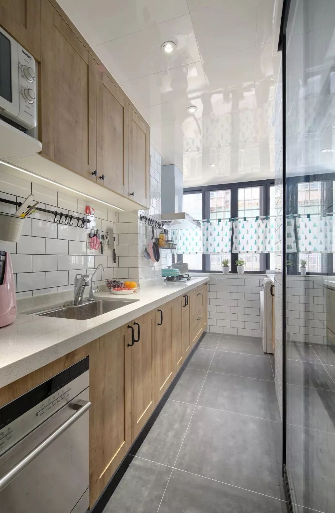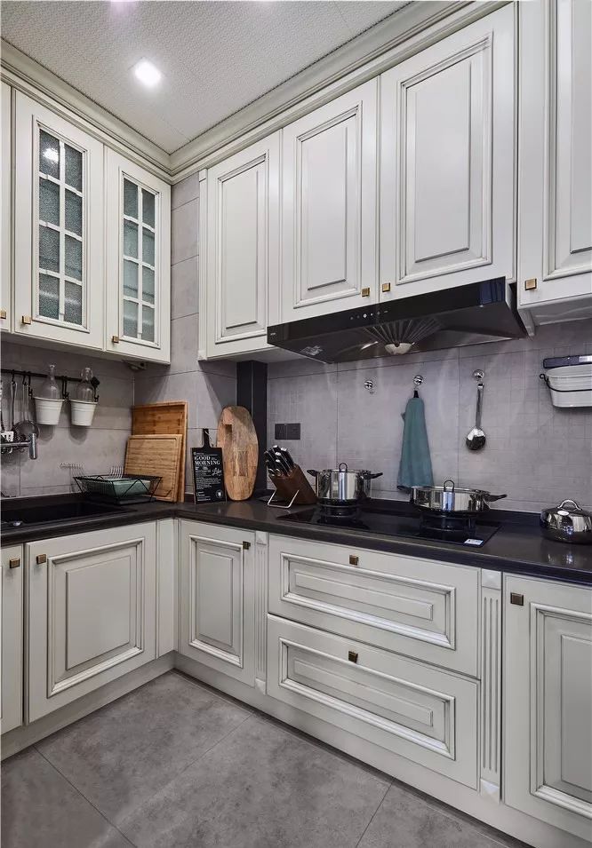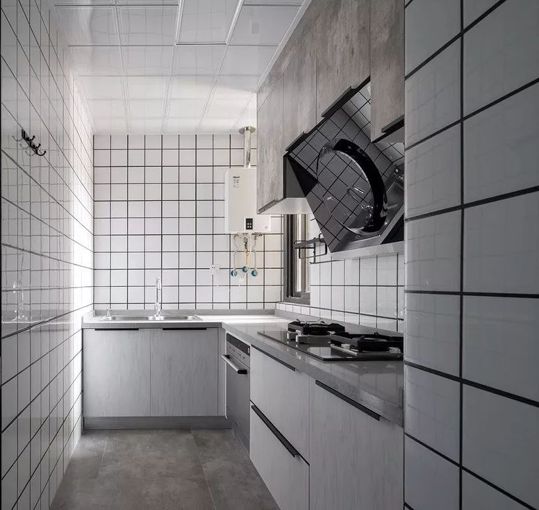 厨房里的每一寸都是值得利用的,多个转角能多出挺多的储物空间或操作台面。在一字型的基础上多了一个转角,就形成了L型的布局。把水槽和灶台放在两端,中间留空的地方作为操作台,平时洗菜-切菜-炒菜的动线布局也非常的合理。