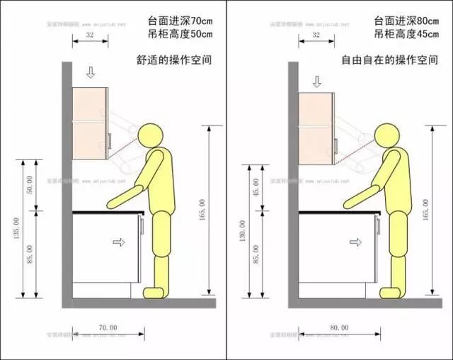 如果橱柜进深为70cm,吊柜距离操作台高度可以降低到50cm左右,操作的舒适度和视线上都有较好的提高;如果橱柜进深为80cm,吊柜距离操作台高度可以降低到45cm左右。
