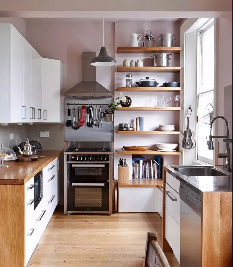 厨房多做搁板,增加收纳的同时也显得非常时尚美观。而且放置厨具的时候非常方便。