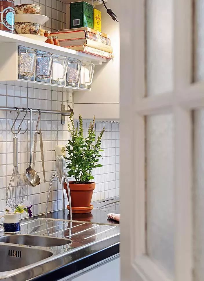 在墙面上安装几根不锈钢管,把常用的锅子、铲子、简单的工具用挂钩上墙,不但大大节省了桌面空间,而且也方便沥水保持干燥。