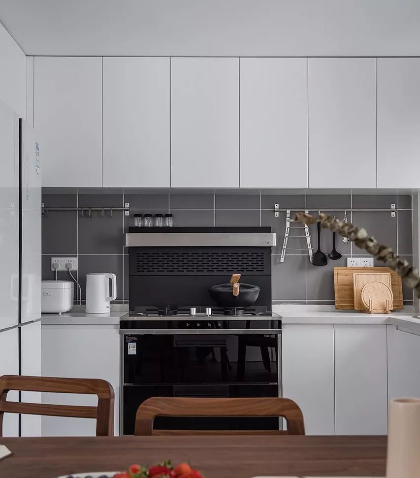 吊柜高度决定了取放物品的便捷性。吊柜低一些,当然方便取放东西,但同时压缩了操作台上方的空间,并且在视觉上会显得压抑,让厨房更显狭小。