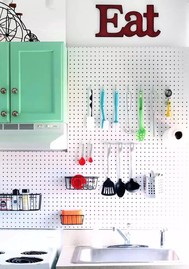 墙面做打孔式的挂钩板,就是时下非常流行的“洞洞板”。上面的挂钩可以随意移动,悬挂锅铲勺子什么的,也是很好地利用了墙面空间,把台面空间释放出来。