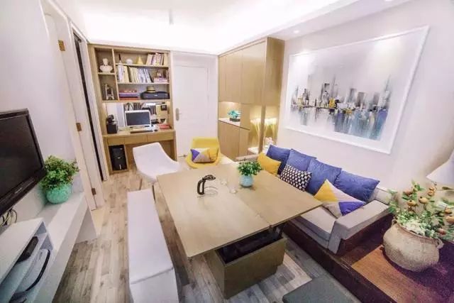 客厅的茶几展开后就是一张小餐桌,进餐或者办公都可以。一个小家具就把客厅与餐厅完美的结合在一起。