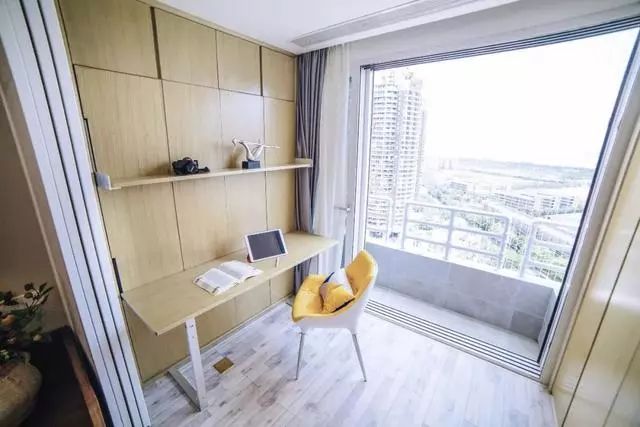 小书房靠着窗,床隐藏在柜子里。原木色的设计非常舒适。