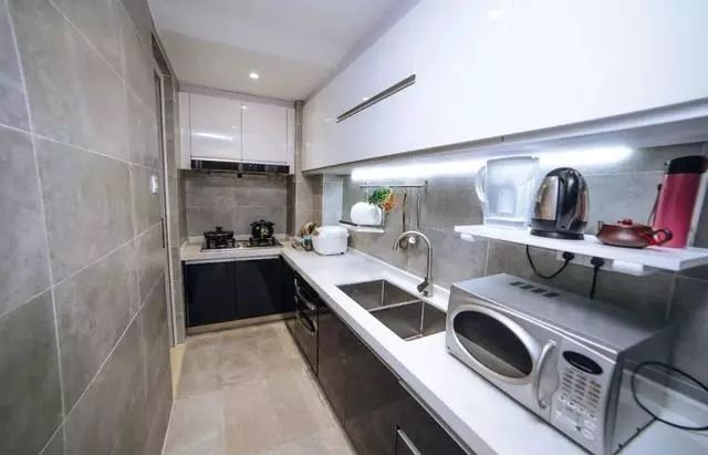 L型的小厨房,采用黑白搭配的橱柜,视觉上不压抑,采光较差所以柜子下面安装了灯,使用方便。