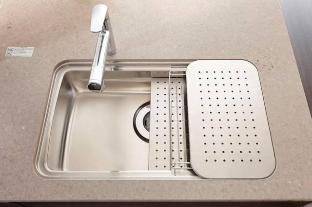 这种实用水槽通过排水板,烹饪板,排水篮等