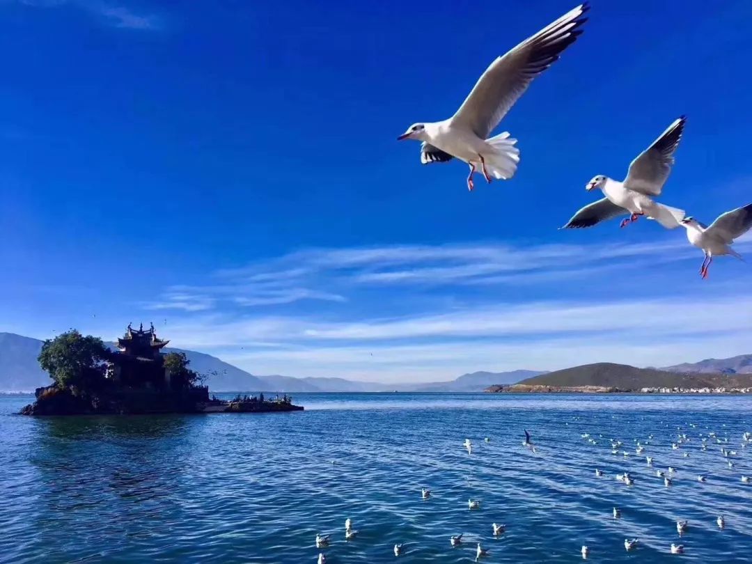 看到红嘴的海鸥在洱海上自由翱翔