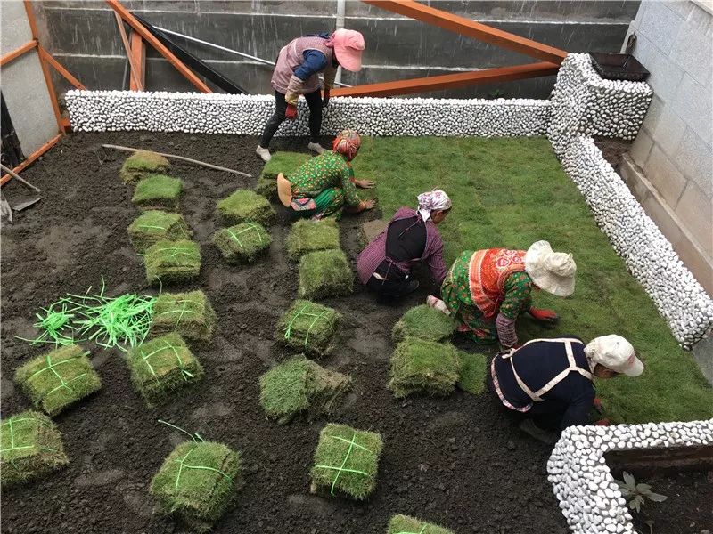 白族的阿姨正在给院子铺草坪