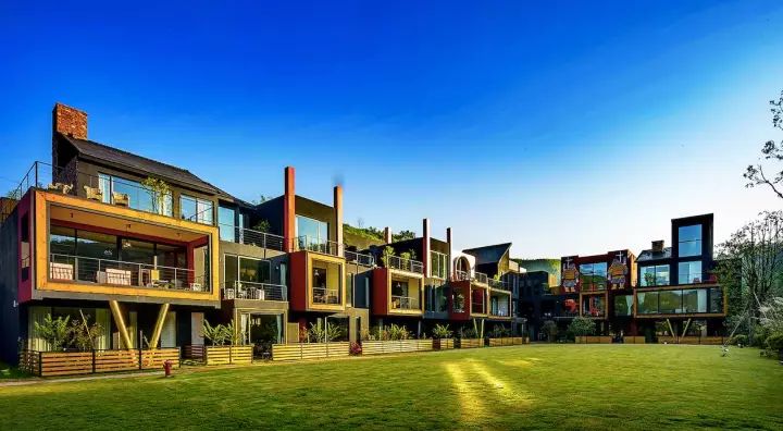建筑设计上,课间建设面积2600多平方,包括4栋小房子,三明治结构,一层与顶层都是公共区,利用空间动线引导客人从房间走出来。极简明快的建筑外观,轮廓硬朗,外墙是“妖娆”的蓝绿色,被设计师戏称为“工业小清新”,室内大面积留白,白色与原木色系为主,色调清爽干净。