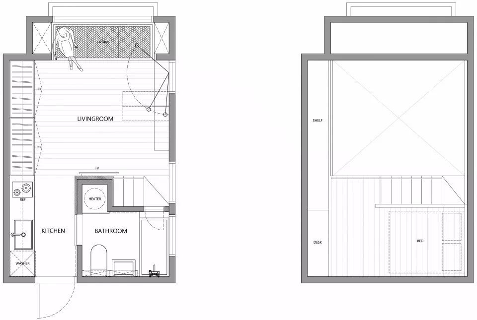除了简单舒适的卧室,偶尔还需要做一些简单的料理;而收纳的需求则以书籍和衣物为主,在下层空间,满足沙发和餐桌的同时,尽量让空间尽可能的空旷,因为偶尔也需要做一些简单的运动。