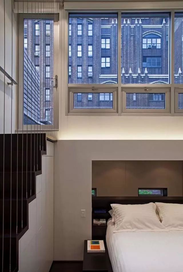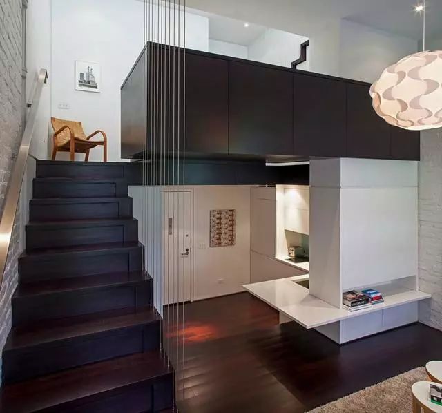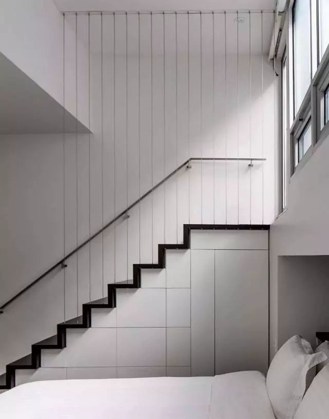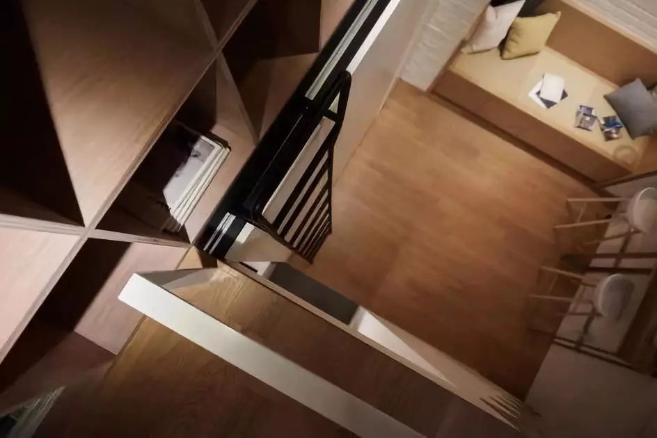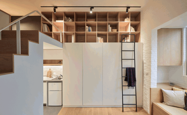 根据使用频率,书柜的设计放置在衣橱之上,厨具柜、衣柜和书架整合在了一个平面上,这样最大化的利用了空间,也让原本房间的高度得到充分的利用,旁边的黑色悬空楼梯,不仅可以方便取物,也可以作为日常悬挂衣物所用。
