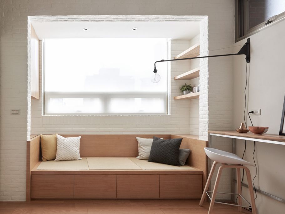 窗边的卧榻及两侧的壁柜,充分利用了窗边凹入的空间,同时也增加了收纳柜和抽屉,取代了客厅的沙发。