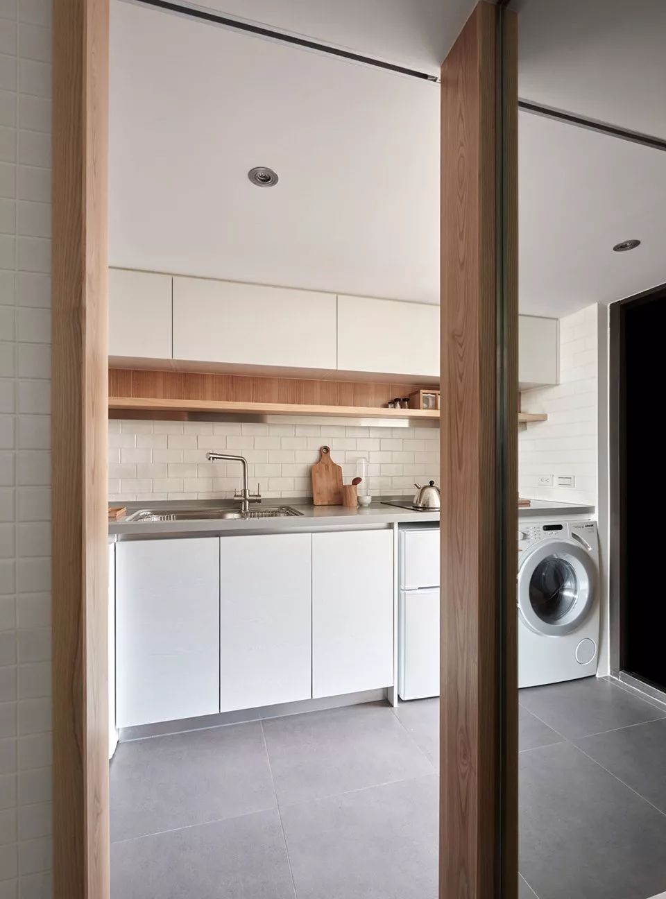 厨具柜的对面是卫生间,洗衣机从浴室移除,被放置在了厨具柜下。