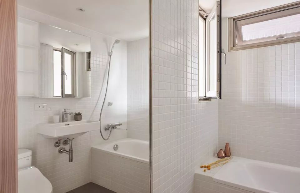 浴室清一色的使用了白色的瓷砖,同样有扩大空间的视觉效果,浴缸和淋浴相结合的设计,工作疲惫之余,即便在家也可以泡个澡。