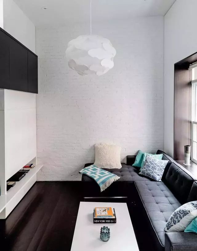 从厨房上去就是客厅,白色的墙壁和黑色的地板,沙发形成鲜明的对比,经典的配色也是百看不厌,转角沙发的出现充分利用了这个小空间,招待三五个朋友完全没有问题。