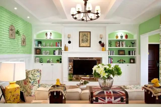 这么显眼的青绿色用在这里还真的是让你心里有种很美好、很宁静的凉爽感觉。而且电视背景墙的造型也设计得很时尚,而且还很实用。再加上青绿色的装饰那简直就是美了美了~~