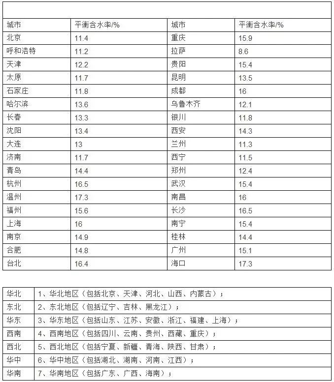 部分城市木材平衡含水率