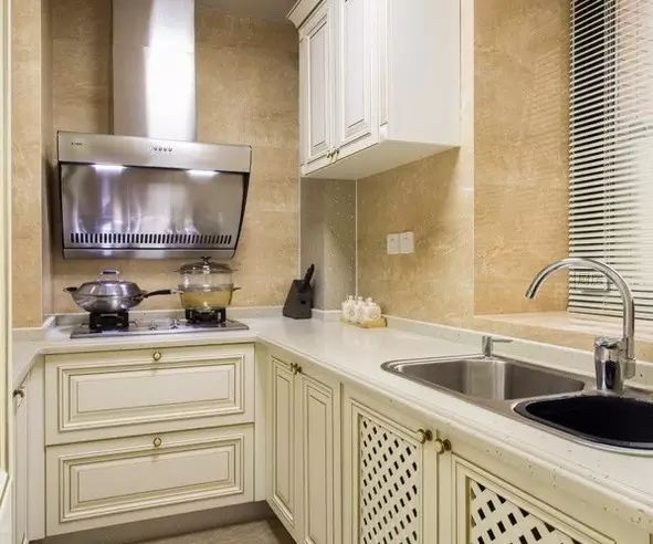 厨房水槽的柜门做了镂空的设计与整体丝毫没有违和感,不过不建议大家讲垃圾桶设计在水槽下面。