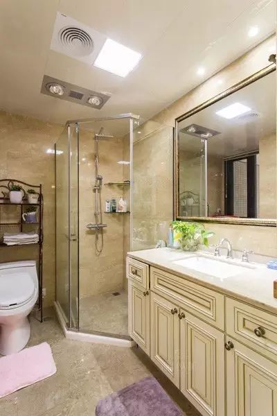 卫生间做了干湿分离,用钻型淋浴间围出墙角,左边马桶、右边浴室柜。